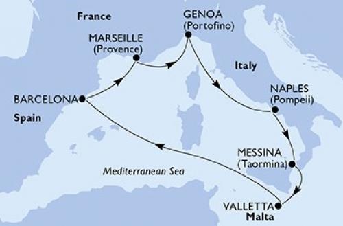 主な寄港地:バルセロナ / マルセイユ / ジェノバ / チビタベッキア/ローマ / メッシーナ(シチリア島) / バレッタなど