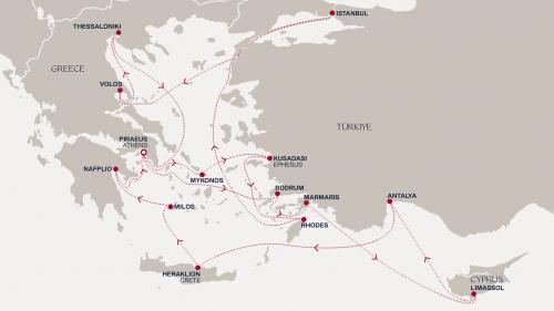 〈主要な寄港地〉 アテネ/ピレウス / ボドルム / マルマリス / リマソール / アンタルヤ / イラクリオン / ミロス島 / ナフプリオン / ミコノス島 / クサダシ / ロードス島 / イスタンブール / ヴォロス / テッサロニキ