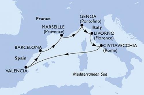 主な寄港地:バルセロナ / マルセイユ / ジェノバ / ナポリ / メッシーナ(シチリア島) / バレッタなど