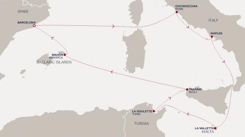 主な寄港地:バルセロナ / マルセイユ / ジェノバ / ナポリ / メッシーナ(シチリア島) / バレッタなど