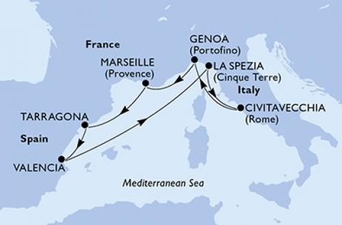 主な寄港地:バルセロナ / マルセイユ / ジェノバ / ナポリ / メッシーナ(シチリア島) / バレッタなど