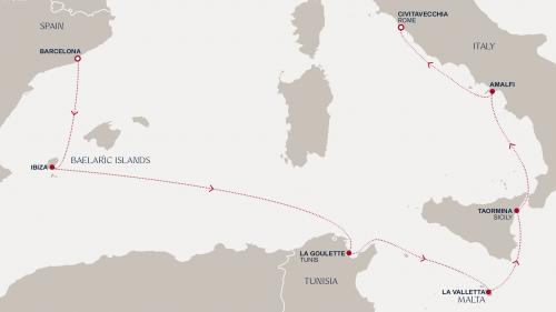 主な寄港地:バルセロナ / マルセイユ / ジェノバ / ナポリ / メッシーナ(シチリア島) / バレッタなど