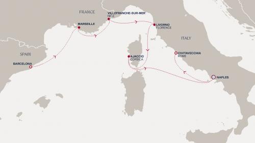 〈主要な寄港地〉 バルセロナ / マルセイユ / ヴィルフランシュ=シュル=メール / リボルノ/フィレンツェ / コルシカ島 / ナポリ / チビタベッキア/ローマ