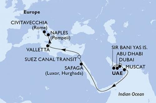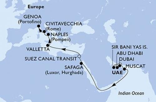 MSCオペラ :2024年発 ナポリ / ジェノバ / シラクサ/シチリア島 / バレッタ / ロードス島 / スエズ運河 / サファガ / シャルムエルシェイク / アカバ / ジッダ / マスカット / アブダビ / ドバイ|出発地 パレルモ(イタリア)