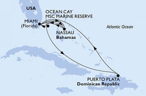 〈主要な寄港地〉 マイアミ / サンファン / フィリップスバーグ / バセテール / セントジョンズ / シャーロットアマリー/セントトーマス島 / アンバーコーブ / ナッソー / オーシャンケイのMSC海洋保護区