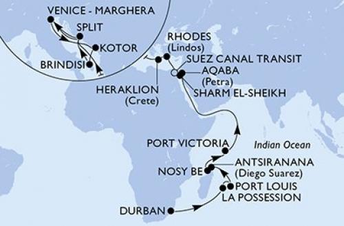 〈主要な寄港地〉 ダーバン / ラ・ポッスシオン / ポートルイス / アンツィラナナ / ノシ・ベ / ポートビクトリア / アカバ / シャルムエルシェイク / スエズ運河 / ロードス島 / イラクリオン / スプリット / ベニス / コトル / ブリンディジ