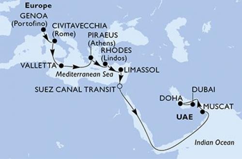 〈主要な寄港地〉 バルセロナ / マルセイユ / ジェノバ / チビタベッキア/ローマ / バレッタ / アテネ/ピレウス / ロードス島 / リマソール / スエズ運河 / マスカット / ドーハ / ドバイ / シルバニヤス島 / アブダビ
