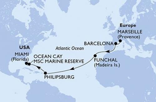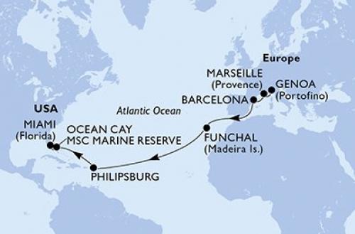 〈主要な寄港地〉 ジェノバ / マルセイユ / バルセロナ / フンシャル(マディラ島) / フィリップスバーグ / オーシャンケイのMSC海洋保護区 / マイアミ