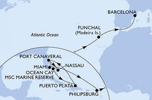 〈主要な寄港地〉 ポート・カナベラル / ナッソー / オーシャンケイのMSC海洋保護区 / アンバーコーブ / マイアミ / フィリップスバーグ / フンシャル(マディラ島) / バルセロナ