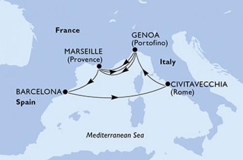 〈主要な寄港地〉 チビタベッキア/ローマ / ジェノバ / マルセイユ / バルセロナ / フンシャル(マディラ島) / フィリップスバーグ / オーシャンケイのMSC海洋保護区 / マイアミ