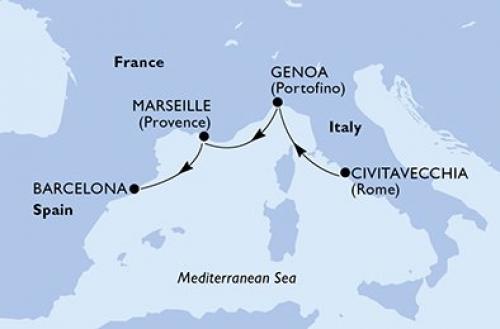 〈主要な寄港地〉 チビタベッキア/ローマ / ジェノバ / マルセイユ / バルセロナ / フンシャル(マディラ島) / フィリップスバーグ / オーシャンケイのMSC海洋保護区 / マイアミ