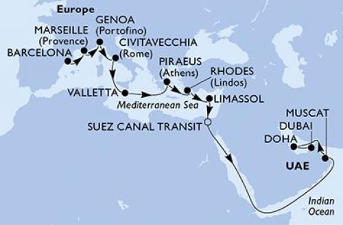 〈主要な寄港地〉 バルセロナ / マルセイユ / ジェノバ / チビタベッキア/ローマ / バレッタ / アテネ/ピレウス / ロードス島 / リマソール / スエズ運河 / マスカット / ドーハ / ドバイ / シルバニヤス島 / アブダビ