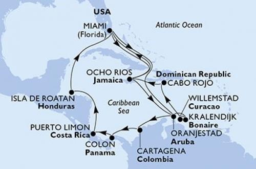〈主要な寄港地〉 マイアミ / オランヘスタード / クラレンダイク / ウィレムスタード / オーチョリオス / オーシャンケイのMSC海洋保護区 / コスメル / ジョージタウン