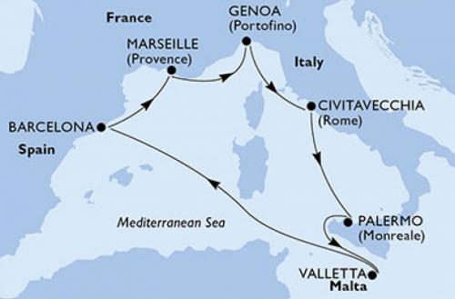 【総額1億円 スーパー還元お年玉セール】 【ベストワン航空券付きツアー:新造船MSCグランディオーサ230,000円~】西地中海 超王道4カ国(イタリア・スペイン・フランス・マルタ共和国)周遊クルーズ12日間 -福岡空港発着-