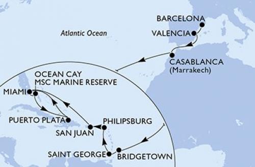 ポート・カナベラル / ナッソー / オーシャンケイのMSC海洋保護区 / アンバーコーブ / マイアミ / フィリップスバーグ / フンシャル(マディラ島) / バルセロナ