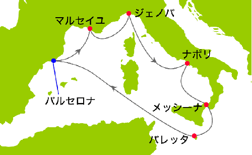 バルセロナ / マルセイユ / ジェノバ / チビタベッキア/ローマ / メッシーナ(シチリア島) / バレッタ