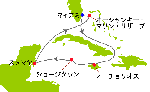 | 3 | 火 | オーシャンキー・マリン・リザーブ (バハマ) | 07:00 | 19:00 | ○ | ○ | ○ | 船内泊 | |