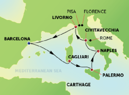 バルセロナ / カリアリ(サルディニア島) / パレルモ / チビタベッキア/ローマ / ピサ/フィレンツェ/ラスペツィア / リボルノ/フィレンツェ