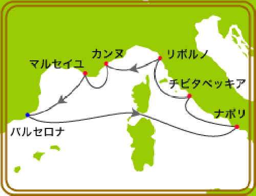 バルセロナ / マルセイユ / ジェノバ / チビタベッキア/ローマ / メッシーナ(シチリア島) / バレッタ