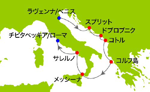 ベニス / ラヴェンナ / スプリット / ドブロブニク / コトル / コルフ島 / メッシーナ(シチリア島) / サレルノ / チビタベッキア/ローマ