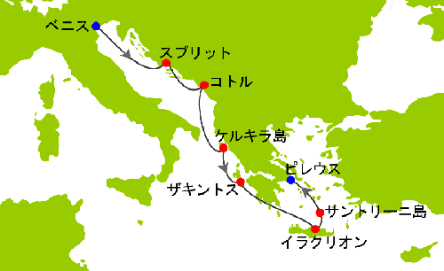 08:00 イラクリオン/クレタ島 (ギリシャ) 入港 イラクリオン半日観光(ランチ付) ●クノッソス宮殿 ●考古学博物館 ●マーリア宮殿 18:00 イラクリオン/クレタ島 (ギリシャ) 出港 |