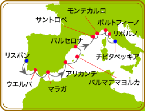 トゥーロン / サントロペ / リボルノ/フィレンツェ / チビタベッキア/ローマ / アリカンテ / マラガ / カディス / リスボン