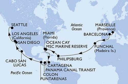 〈主要な寄港地〉 マルセイユ / バルセロナ / フンシャル(マディラ島) / フィリップスバーグ / オーシャンケイのMSC海洋保護区 / マイアミ / カルタヘナ / コロン / パナマ運河 / プンタレナス / カボサンルーカス / サンディエゴ / ロサンゼルス / シアトル