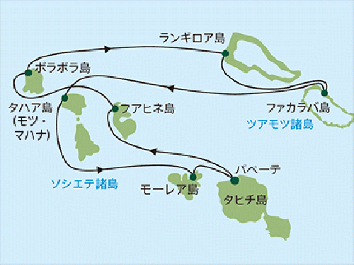 パペーテ/タヒチ島 / ファカラヴァ環礁 / ライアテア島 / ボラボラ島 / 赤道 / ホノルル(オアフ島) / カイルア・コナ / プエルトバヤルタ / ウアトルコ / プエルト・チャパス / プエルトケツァル / プンタレナス / バルボア / パナマ運河 / クリストバル港 / カルタヘナ / マイアミ