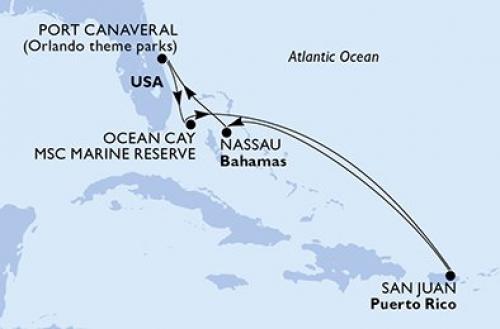 〈主要な寄港地〉 ポート・カナベラル / ナッソー / オーシャンケイのMSC海洋保護区 / アンバーコーブ / マイアミ / フィリップスバーグ / フンシャル(マディラ島) / バルセロナ