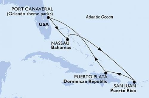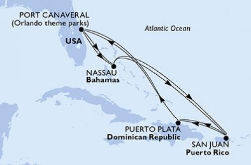 〈主要な寄港地〉 ポート・カナベラル / コスメル / ジョージタウン / ファルマス / ナッソー / オーシャンケイのMSC海洋保護区 / アンバーコーブ