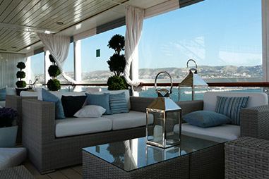 - 運航しております客船は、「王者」と意味を持つ地中海の星-SOVEREIGN-と、吹き抜けのアトリウムを持つ海上の巨大ホテル-EMPRESS-の2隻です。SOVEREIGNは7階までの吹き抜けの輝くガラスのエレベーターと、ゆったりした大理石の階段がゴージャスな雰囲気と重厚感のある美しさを生み出しております。EMPRESSはスペインの気風に合わせた調和と美、そしてくつろぎをお約束いたします。まるでご自宅にいるような心地よさを感じられることでしょう。