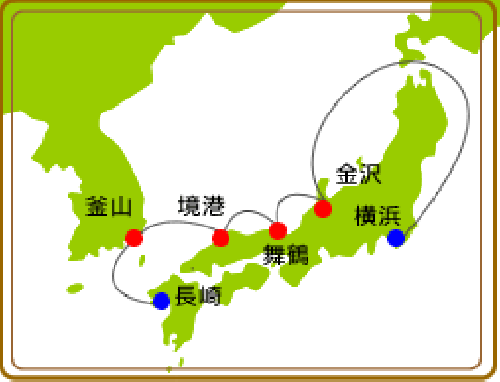 横浜 / 金沢(石川県) / 舞鶴 / 舞鶴 / 境港 / 釜山 / 長崎