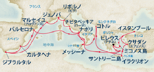 アテネ/ピレウス / サントリーニ島 / コルフ島 / ミコノス島 / クレタ島 / コトル / メッシーナ(シチリア島) / ナポリ / ジェノバ / ピサ/フィレンツェ/ラスペツィア / リボルノ/フィレンツェ / チビタベッキア/ローマ / ジブラルタル / バルセロナ / マルセイユ