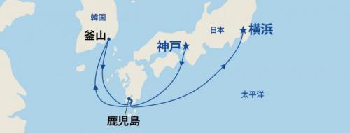 神戸 / 横浜 / 鹿児島 / 宮古島 / 香港 / ハロン湾 / ダナン / ホーチミン / シアヌークビル / シンガポール / バンダルスリブガワン / コタキナバル(ボルネオ島) / 那覇 / 横浜 / 神戸