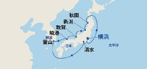 | 1 | 横浜 | 午後乗船 | 17:00 | 船中泊 |