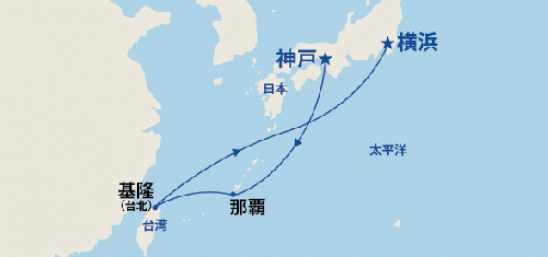 神戸 / 横浜 / 鹿児島 / 宮古島 / 香港 / ハロン湾 / ダナン / ホーチミン / シアヌークビル / シンガポール / バンダルスリブガワン / コタキナバル(ボルネオ島) / 那覇 / 横浜 / 神戸