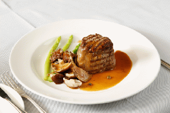 ディナーはメインダイニングでのフルコース、日替わりメニューの中からお好きな前菜、スープ・サラダ、メイン、デザートを選んで頂く方式です。