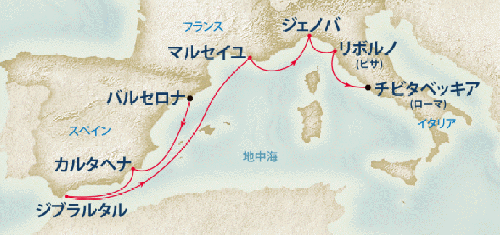 バルセロナ / マルセイユ / ジェノバ / チビタベッキア/ローマ / メッシーナ(シチリア島) / バレッタ