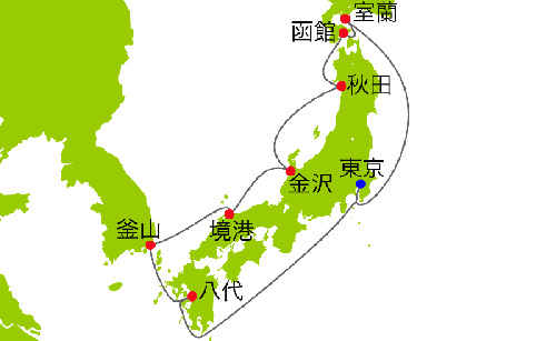 東京 / 鹿児島 / 奄美大島(鹿児島) / 那覇 / 基隆(台北) / 花蓮 / 高雄 / 台中 / 長崎 / 釜山