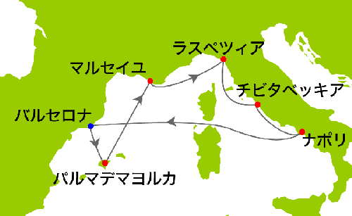 バルセロナ / マルセイユ / ジェノバ / チビタベッキア/ローマ / メッシーナ(シチリア島) / バレッタ