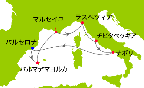 バルセロナ / マルセイユ / ジェノバ / チビタベッキア/ローマ / メッシーナ(シチリア島) / バレッタ