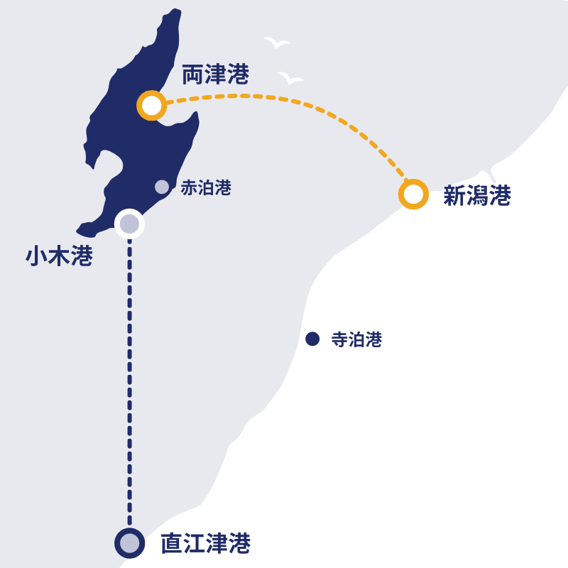 新潟港~両津港間にはジェットフォイルとカーフェリーが運航しています。