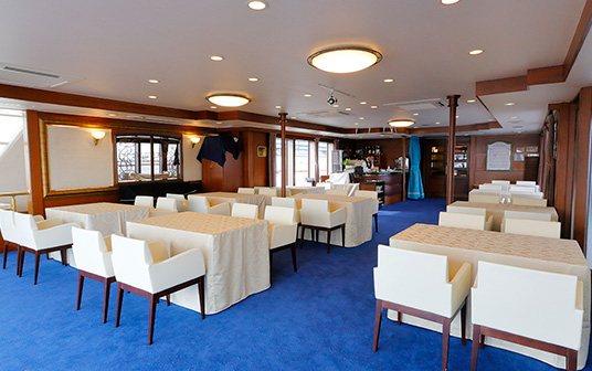 エンペラー : 1階前方メインレストランでランチを召し上がりながら、ゆっくりと東京のダイナミックな景色をご堪能ください。ポロネーズ : 3階前方レストラン・バンケット・ウェディングなどの様々なシーンに合わせた料理を船内一貫調理で行っています。パストラル : 1階前方季節の食材を凝らしたフレンチ、イタリアン、バイキングを調理し、メニューも3ヵ月に一度全面リニューアルしています。