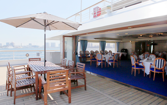 オープンデッキ : 4階中央海を眺めながらゆったりとした贅沢な時間を楽しめます。パノラマデッキ : 4階中央東京タワーや東京スカイツリーの景色はぜひデッキにてお楽しみください。