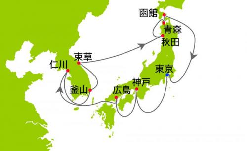 東京 / 神戸 / 広島 / 仁川<インチョン> / 釜山 / 束草 / 秋田 / 青森 / 函館(北海道)