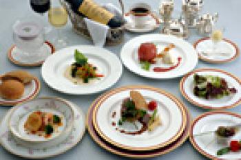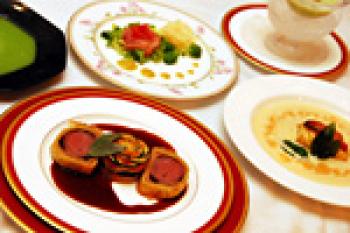 ディナーはメインダイニングでのフルコース、日替わりメニューの中からお好きな前菜、スープ・サラダ、メイン、デザートを選んで頂く方式です。