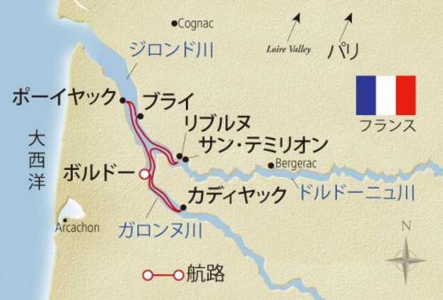 | 2 | ポーイヤック | ポーイヤックで下船、郊外をドライブ、マルゴーワインを含む、この地域の代表的なワインを試飲。シャトー・ラフィット・ロートシルト、ラトゥールやムートン・ロートシルトなどはポーイヤックの銘柄、自由時間 |