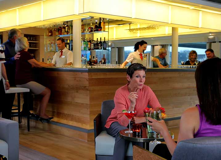 レセプション : 2階中央寄港地では様々なエクスカーションをご提供します。フロントへご相談ください。オブザベ―ションラウンジ : 3階前方ご友人やご家族、恋人とおしゃべりをしながらすごすならこちらへ。ビバレッジバー : 3階前方軽いお飲み物などはセルフでお飲みいただくことができます。