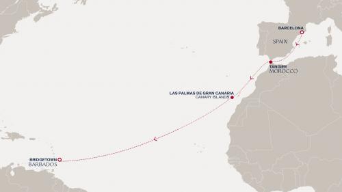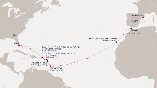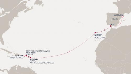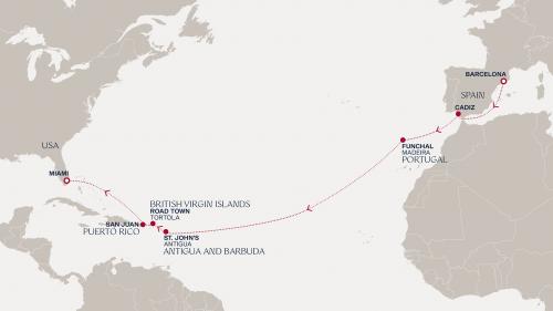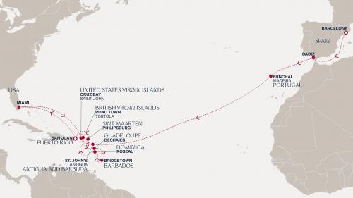 〈主要な寄港地〉 バルセロナ / カディス / フンシャル(マディラ島) / プンタレナス / ロードタウン / サンファン / マイアミ / ブリッジタウン / ロゾー / フィリップスバーグ