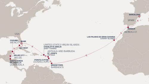 〈主要な寄港地〉 バルセロナ / タンジール / ラスパルマス / ブリッジタウン / ポワンタピートル / プンタレナス / チャンメイ / マイアミ / コスメル / ベリーズ / サントロペ / キーウェスト